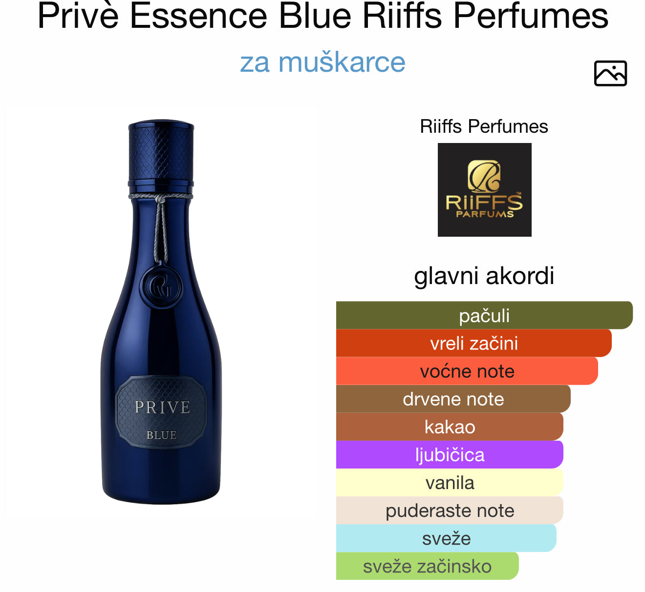 Privè Essence Blue od Riiffs Perfumes je aromatični miris za muškarce. Ovo je novi parfem. Privè Essence Blue je predstavljen 2025. Gornje note su Zelena jabuka, Sichuan (kineski) biber i Duvan; srednje note su pačuli, Ljubičica i Kakao; bazne note su vanilija sa Madagaskara, Koža i Labdanum.
